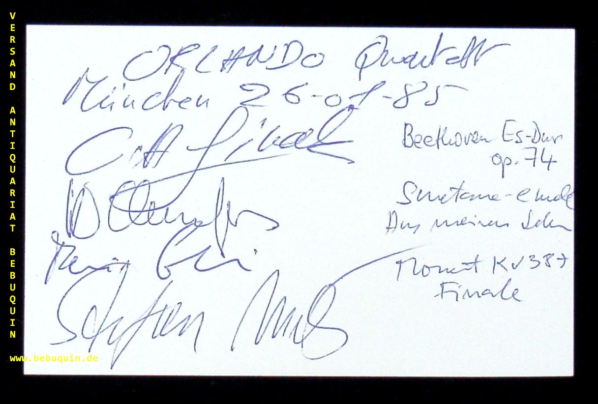 ORLANDO QUARTETT.– LINALE, Charles-André + OBERNDOEFER, Heinz + ERBLICH, Ferdinand + METZ, Stephan: eigenhändig von allen signierte und datierte Autogrammkarte. München (Schleißheim), 26.1.985. 8 x 12,5 cm. Karteikarte. The Orlando Quartet was a classical music string quartet based in Amsterdam, formed in 1976 and active until 1997. (Wikipedia)