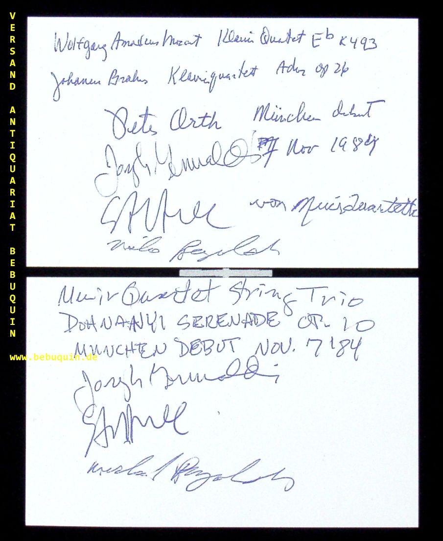 MUIR QUARTETT.– GENUALDI, Joseph (Violinist) + ANSELL, Steven (Bratschist) + ORTH, Peter (Pianist) + REYNOLDS, Michael (Cellist): 2 eigenhändig von allen signierte Autogrammkarten. München (Philharmonie), 7.11.1984. 8 x 12,5 cm. Karteikarten. amerikanisches Streichquartett seit 1979.