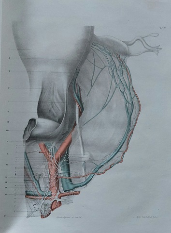 MEDIZIN.– FRANKENHÄUSER, Fritz: Die Nerven der Gebärmutter und ihre Endigung in den glatten Muskelfasern. Ein Beitrag zur Anatomie und Gynäkologie. Jena (Mauke), 1867. Fol. IV, 82 S. + 8 teilkolorierte ganzseitige Tafeln. OHLn. Einband gebräunt und fingerspurig, sonst gute Erhaltung. Einzige Ausgabe der Arbeit über die Nerven des Uterus von Ferdinand Frankenhäuser, nach dem der Frankenhäuser Plexus benannt ist! Die sehr feinen Tafeln wurden von Frankenhaeuser selbst nach der Natur gezeichnet und von A. Schütze vom Lith. Institut Berlin lithografiert. Ferdinand Frankenhäuser, „Gynäkologe, war Schüler und Assistent von Ed. Martin in Jena, wurde um 1860 Privatdozent in Jena, 1869 Extraordinarius daselbst, 1872 ord. Prof. in Zürich, wo er bis 1888 blieb, um sich dann nach Jena zurückzuziehen. Hier starb er 3. Februar 1894. Er verfasste u.a. eine Abhandlung über Uterusnerven und deren Endigungen (1867), sowie verschiedene Beiträge für das Corresp.-Bl. d. Schweizer Ärzte, z.T. durch Schüler von ihm publiziert.“ (Pagel: Biogr. Lex., Sp. 54)