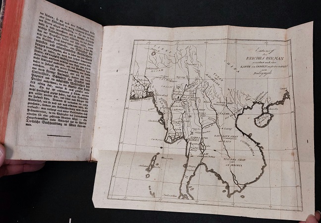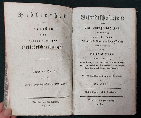 ASIEN.– SYMES, Michael: Gesandtschaftsreise nach dem Königreiche Ava, im Jahre 1795 auf Befehl des General-Gouverneurs von Ostindien unternommen. Nebst einer Einleitung in die Geschichte von Ava, Pegu, Arracan, Beschreibung des Landes und Bemerkungen über Verfassung, Sitten und Sprache der Birmanen. D.v. Hager. Berlin/Hamburg, 1801. 434 (2) S. mit 1 gefalteten Karte und 6 Kupfern. Hldr der Zeit mit zwei farb Rückenschildern. Kanten leicht berieben, sonst vollständig und gut. = Bibliothek der neuesten und interessantesten Reisebeschreibungen, Band 5. dt. EA. Michael Symes (1761–22 January 1809) was an Irish soldier, diplomat and politician. (Wikipedia)
