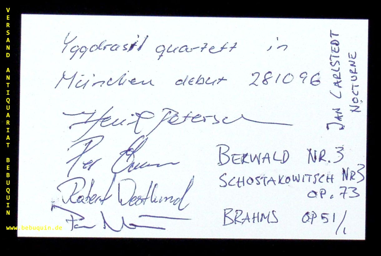 YGGDRASIL QUARTETT.– PETERSON, Henrik + ÖMAN, Per + WESTLUND, Robert + NYSTRÖM, Per: eigenhändig von allen signierte und datierten Autogrammkarte: debut. München (Herkulessaal), 28.10.1996. 8 x 12,5 cm. Karteikarte. The Yggdrasil Quartet is a swedish string quartet founded in 1990. Yggdrasil is the name of the great ash tree at the center of much Nordic mythology. (Wikipedia)