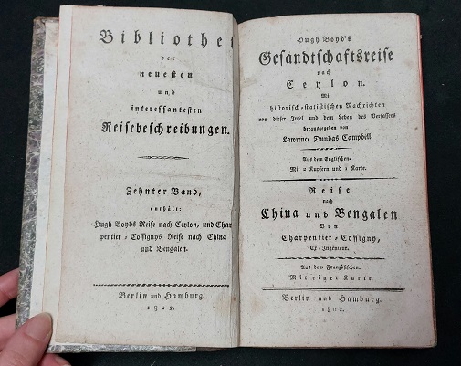 ASIEN.– BOYD, Hugh: Hugh Boyd’s Gesandtschaftsreise nach Ceylon. Mit historisch-statistischen Nachrichten von dieser Insel und dem Leben des Verfassers. Hrsg. von Lawrence Dundas Campbell. Berlin/Hamburg, 1802. 8°. 435 S. mit 2 Kupfern und 2 gefalteten Karten. HLdr der Zeit mit 2 farb. Rückenschildern. gutes Ex. = Bibliothek der neuesten und interessantesten Reisebeschreibungen, 10. dt. EA. Angebunden – Carpentier-Cossigny: Reise nach China und Bengalen. Bericht einer diplomatischen Reise zum König von Ceylon (Sri Lanka) `A journal of an embassy from the Government of Madras, to the king of Candy, in Ceylon, in the year 1782` des Iren Hugh Boyd (1746-1794), der 1781 eine Stelle als Sekretär des Gouverneuers von Madras, Lord Macartnay, angenommen hatte und eines Berichts des Ingenieurs der französischen Ostindiengesellschaft, J. F. Charpentier de Cossigny (1736-1809), von seiner Reise nach China und Bengalen. (Engelmann. Bibliotheca geographica 130 u. 132; Griep/Luber II, 1060; Vgl. Cox I.309)