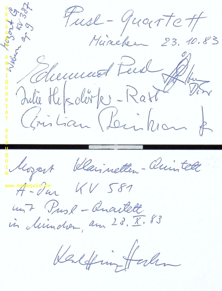 PUSL QUARTET.– HAHN, Karl-Heinz (Klarinette) + PUSL, Edmund + HESSDÖRFER, Julie + STEINKRAUSS, P. Christian + DIRR, Hermann: 2 eigenhändig von allen signierte und datierte Autogrammkarten. München (Herkulessaal), 23.10.1983. 8 x 12,5 cm. 2 Karteikarten.