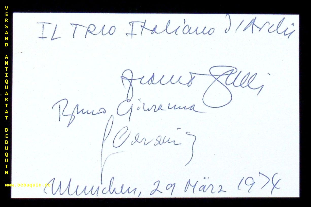 TRIO ITALIANO D’ARCHI.– GULLI, Franco + GIURANNA, Bruno + CARAMIA, Giacionto: eigenhändig von allen signierte Autogrammkarte. München (Herkulessaal), 29.3.1974. 8 x 12,5 cm. Karteikarte. Il Trio Italiano d’Archi è stato un trio da camera italiano. (Wikipedia)