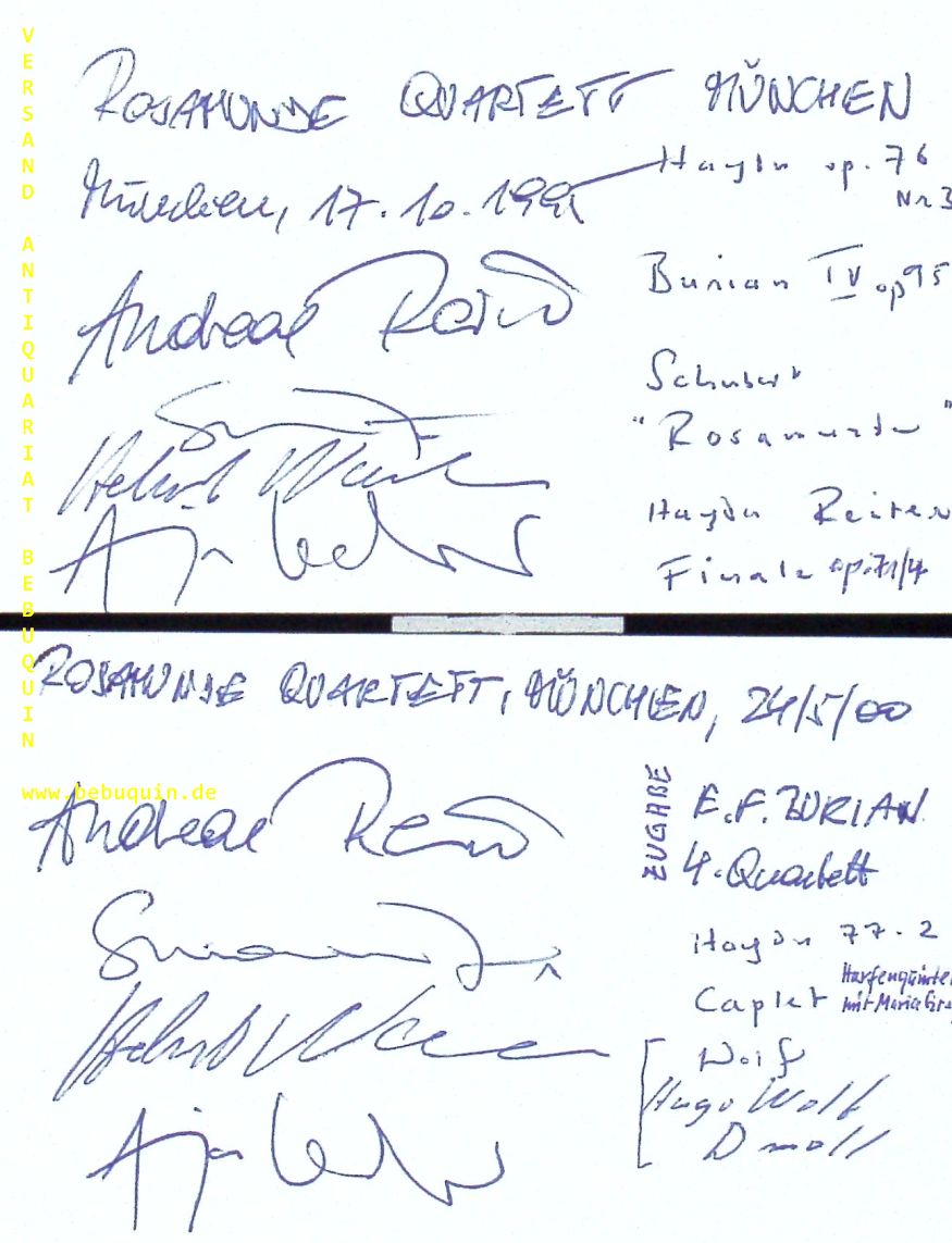 ROSAMUNDE QUARTETT.– REINER, Andres + FORDHAM, Simon + NICOLAI, Helmut + LECHNER, Anja: 2 eigenhändig signierte und datierten Autogrammkarten. München (Herkulessaal), 1995 + 2000. 8 x 12,5 cm. Karteikarte. Das Rosamunde Quartett war ein 1992 gegründetes deutsches Streichquartett, das bis 2009 bestand. Der Name des Ensembles geht auf Franz Schuberts Streichquartett Nr. 13 „Rosamunde“ zurück. (Wikipedia)