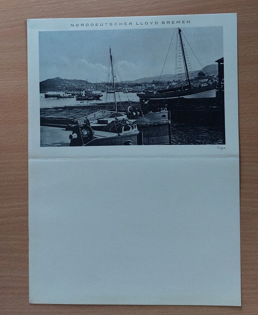 SCHIFFAHRT.– NORDDEUTSCHER LLOYD BREMEN.– Menükarte des Dampfers „LÜTZOW“ vom 25. Mai 1927 IV. Mittelmeer-Fahrt 1927. Bremen (NDL), 1927. Faltblatt mit Ansicht von Vigo. gutes Ex. Der Reichspostdampfer Lützow war das zehnte Schiff der Feldherren-Klasse des Norddeutschen Lloyd (NDL) für den Dienst nach Ostasien und Australien. Das Schiff war benannt nach dem preußischen Generalmajor Ludwig Adolf Wilhelm von Lützow (1782–1834), dem Kommandeur der „Schwarzen Jäger“. Die 1914 von den Briten im Sueskanal beschlagnahmte Lützow wurde 1923 vom NDL zurückgekauft und bis 1932 auf dem Nordatlantik und zu Kreuzfahrten eingesetzt. Sie war das erste Schiff, das ein Flugzeug mit sich führte, um seinen Passagieren Rundflüge anzubieten. (…) Nach Reparatur und Umbau mit 8716 BRT vermessen, verfügte die Lützow über Einrichtungen für 820 Passagiere nur in der II. und III. Klasse. Am 14. Juni 1924 trat sie ihre erste Nachkriegsreise für den NDL nach New York an. Auch nach Kanada wurde sie eingesetzt. Im Juni 1925 führte sie erstmals drei Nordland-Kreuzfahrten durch. 1926 folgten fünf Mittelmeer-Kreuzfahrten ab dem 12. Februar: Die Lützow lief von Bremerhaven rund um Spanien in 16 Tagen nach Genua, von dort ging die zweite Reise in 15 Tagen über neun Zwischenhäfen nach Venedig und die dritte Reise von dort in 26 Tagen über Griechenland bis Konstantinopel, über Palästina nach Alexandria und zurück nach Venedig. Die vierte und fünfte Reise wiederholten die beiden ersten in umgekehrter Richtung. 1927 standen Mittelmeer- und Nordlandfahrten, aber auch eine Ostsee-/Skandinavien-Kreuzfahrt auf dem Programm; bis 1931 waren es insgesamt 17 Kreuzfahrten.