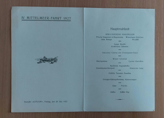 SCHIFFAHRT.– NORDDEUTSCHER LLOYD BREMEN.– Menükarte des Dampfers „LÜTZOW“ vom 20. Mai 1927 IV. Mittelmeer-Fahrt 1927. Bremen (NDL), 1927. Faltblatt mit Ansicht von Malaga. gutes Ex. Der Reichspostdampfer Lützow war das zehnte Schiff der Feldherren-Klasse des Norddeutschen Lloyd (NDL) für den Dienst nach Ostasien und Australien. Das Schiff war benannt nach dem preußischen Generalmajor Ludwig Adolf Wilhelm von Lützow (1782–1834), dem Kommandeur der „Schwarzen Jäger“. Die 1914 von den Briten im Sueskanal beschlagnahmte Lützow wurde 1923 vom NDL zurückgekauft und bis 1932 auf dem Nordatlantik und zu Kreuzfahrten eingesetzt. Sie war das erste Schiff, das ein Flugzeug mit sich führte, um seinen Passagieren Rundflüge anzubieten. (…) Nach Reparatur und Umbau mit 8716 BRT vermessen, verfügte die Lützow über Einrichtungen für 820 Passagiere nur in der II. und III. Klasse. Am 14. Juni 1924 trat sie ihre erste Nachkriegsreise für den NDL nach New York an. Auch nach Kanada wurde sie eingesetzt. Im Juni 1925 führte sie erstmals drei Nordland-Kreuzfahrten durch. 1926 folgten fünf Mittelmeer-Kreuzfahrten ab dem 12. Februar: Die Lützow lief von Bremerhaven rund um Spanien in 16 Tagen nach Genua, von dort ging die zweite Reise in 15 Tagen über neun Zwischenhäfen nach Venedig und die dritte Reise von dort in 26 Tagen über Griechenland bis Konstantinopel, über Palästina nach Alexandria und zurück nach Venedig. Die vierte und fünfte Reise wiederholten die beiden ersten in umgekehrter Richtung. 1927 standen Mittelmeer- und Nordlandfahrten, aber auch eine Ostsee-/Skandinavien-Kreuzfahrt auf dem Programm; bis 1931 waren es insgesamt 17 Kreuzfahrten.