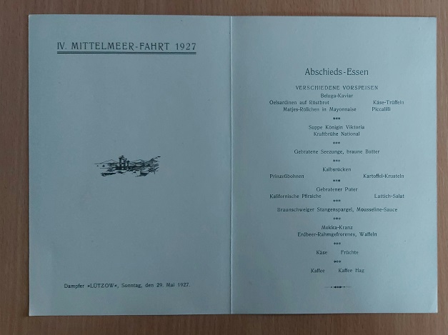 SCHIFFAHRT.– NORDDEUTSCHER LLOYD BREMEN.– Menükarte des Dampfers „LÜTZOW“ vom 29. Mai 1927 IV. Mittelmeer-Fahrt 1927. Bremen (NDL), 1927. Faltblatt mit Ansicht der Lützow bei der Ankunft in Bremerhaven. mit Eckbug, sonst gutes Ex. Der Reichspostdampfer Lützow war das zehnte Schiff der Feldherren-Klasse des Norddeutschen Lloyd (NDL) für den Dienst nach Ostasien und Australien. Das Schiff war benannt nach dem preußischen Generalmajor Ludwig Adolf Wilhelm von Lützow (1782–1834), dem Kommandeur der „Schwarzen Jäger“. Die 1914 von den Briten im Sueskanal beschlagnahmte Lützow wurde 1923 vom NDL zurückgekauft und bis 1932 auf dem Nordatlantik und zu Kreuzfahrten eingesetzt. Sie war das erste Schiff, das ein Flugzeug mit sich führte, um seinen Passagieren Rundflüge anzubieten. (…) Nach Reparatur und Umbau mit 8716 BRT vermessen, verfügte die Lützow über Einrichtungen für 820 Passagiere nur in der II. und III. Klasse. Am 14. Juni 1924 trat sie ihre erste Nachkriegsreise für den NDL nach New York an. Auch nach Kanada wurde sie eingesetzt. Im Juni 1925 führte sie erstmals drei Nordland-Kreuzfahrten durch. 1926 folgten fünf Mittelmeer-Kreuzfahrten ab dem 12. Februar: Die Lützow lief von Bremerhaven rund um Spanien in 16 Tagen nach Genua, von dort ging die zweite Reise in 15 Tagen über neun Zwischenhäfen nach Venedig und die dritte Reise von dort in 26 Tagen über Griechenland bis Konstantinopel, über Palästina nach Alexandria und zurück nach Venedig. Die vierte und fünfte Reise wiederholten die beiden ersten in umgekehrter Richtung. 1927 standen Mittelmeer- und Nordlandfahrten, aber auch eine Ostsee-/Skandinavien-Kreuzfahrt auf dem Programm; bis 1931 waren es insgesamt 17 Kreuzfahrten.