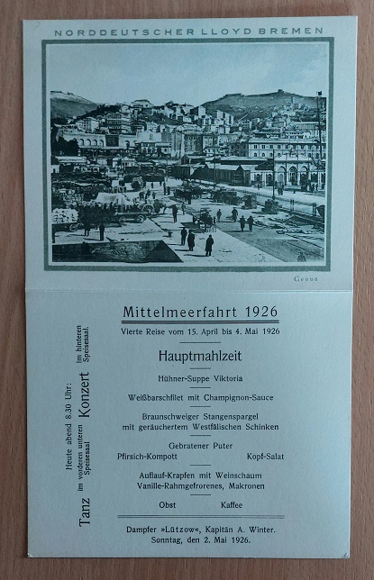 SCHIFFAHRT.– NORDDEUTSCHER LLOYD BREMEN.– Menükarte des Dampfers „LÜTZOW“ vom 2. Mai. Vierte Reise. Mittelmeerfahrt 1926. Bremen (NDL), 1926. 12 °. Faltblatt mit Ansicht von Genua. gutes Ex. Der Reichspostdampfer Lützow war das zehnte Schiff der Feldherren-Klasse des Norddeutschen Lloyd (NDL) für den Dienst nach Ostasien und Australien. Das Schiff war benannt nach dem preußischen Generalmajor Ludwig Adolf Wilhelm von Lützow (1782–1834), dem Kommandeur der „Schwarzen Jäger“. Die 1914 von den Briten im Sueskanal beschlagnahmte Lützow wurde 1923 vom NDL zurückgekauft und bis 1932 auf dem Nordatlantik und zu Kreuzfahrten eingesetzt. Sie war das erste Schiff, das ein Flugzeug mit sich führte, um seinen Passagieren Rundflüge anzubieten. (…) Nach Reparatur und Umbau mit 8716 BRT vermessen, verfügte die Lützow über Einrichtungen für 820 Passagiere nur in der II. und III. Klasse. Am 14. Juni 1924 trat sie ihre erste Nachkriegsreise für den NDL nach New York an. Auch nach Kanada wurde sie eingesetzt. Im Juni 1925 führte sie erstmals drei Nordland-Kreuzfahrten durch. 1926 folgten fünf Mittelmeer-Kreuzfahrten ab dem 12. Februar: Die Lützow lief von Bremerhaven rund um Spanien in 16 Tagen nach Genua, von dort ging die zweite Reise in 15 Tagen über neun Zwischenhäfen nach Venedig und die dritte Reise von dort in 26 Tagen über Griechenland bis Konstantinopel, über Palästina nach Alexandria und zurück nach Venedig. Die vierte und fünfte Reise wiederholten die beiden ersten in umgekehrter Richtung. 1927 standen Mittelmeer- und Nordlandfahrten, aber auch eine Ostsee-/Skandinavien-Kreuzfahrt auf dem Programm; bis 1931 waren es insgesamt 17 Kreuzfahrten.