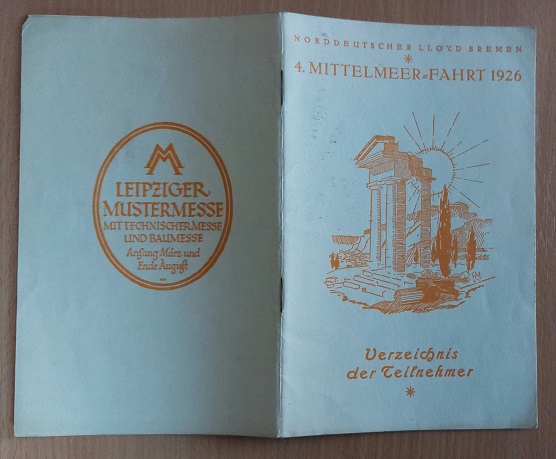 SCHIFFAHRT.– NORDDEUTSCHER LLOYD BREMEN.– Verzeichnis der Tielnehmer. IV. Mittelmeer-Fahrt 1926 mit Dam pger „Lützow“ vom 15. April bis 4. Mai von Venedig.. Bremen (NDL), 1926. 14 Bl. ill. OKart. kaum bestaubt. Der Reichspostdampfer Lützow war das zehnte Schiff der Feldherren-Klasse des Norddeutschen Lloyd (NDL) für den Dienst nach Ostasien und Australien. Das Schiff war benannt nach dem preußischen Generalmajor Ludwig Adolf Wilhelm von Lützow (1782–1834), dem Kommandeur der „Schwarzen Jäger“. Die 1914 von den Briten im Sueskanal beschlagnahmte Lützow wurde 1923 vom NDL zurückgekauft und bis 1932 auf dem Nordatlantik und zu Kreuzfahrten eingesetzt. Sie war das erste Schiff, das ein Flugzeug mit sich führte, um seinen Passagieren Rundflüge anzubieten. (…) Nach Reparatur und Umbau mit 8716 BRT vermessen, verfügte die Lützow über Einrichtungen für 820 Passagiere nur in der II. und III. Klasse. Am 14. Juni 1924 trat sie ihre erste Nachkriegsreise für den NDL nach New York an. Auch nach Kanada wurde sie eingesetzt. Im Juni 1925 führte sie erstmals drei Nordland-Kreuzfahrten durch. 1926 folgten fünf Mittelmeer-Kreuzfahrten ab dem 12. Februar: Die Lützow lief von Bremerhaven rund um Spanien in 16 Tagen nach Genua, von dort ging die zweite Reise in 15 Tagen über neun Zwischenhäfen nach Venedig und die dritte Reise von dort in 26 Tagen über Griechenland bis Konstantinopel, über Palästina nach Alexandria und zurück nach Venedig. Die vierte und fünfte Reise wiederholten die beiden ersten in umgekehrter Richtung. 1927 standen Mittelmeer- und Nordlandfahrten, aber auch eine Ostsee-/Skandinavien-Kreuzfahrt auf dem Programm; bis 1931 waren es insgesamt 17 Kreuzfahrten.