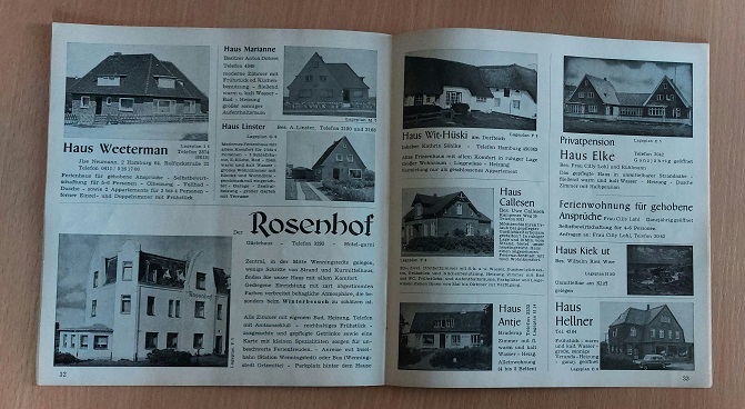 SYLT.– FREMDENVERKEHRSVEREIN WENNINGSTEDT-BRFADERUP / SYLT: (Hrsg.) Wohnungsliste 1969 von Nordsee-Heilbad Wenningstedt-Braderup Sylt. Westerland (Buchsteiner), 1968. 20 x 20 cm. 48 S. (incl. Umschlag) mit hunderten von Bildern der einzelnen Häuser sowie 2 Stadtplänen. ill. OBr. kaum gebräunt und bestoßen. Diese Wohnungsliste von musealer Seltenheit.