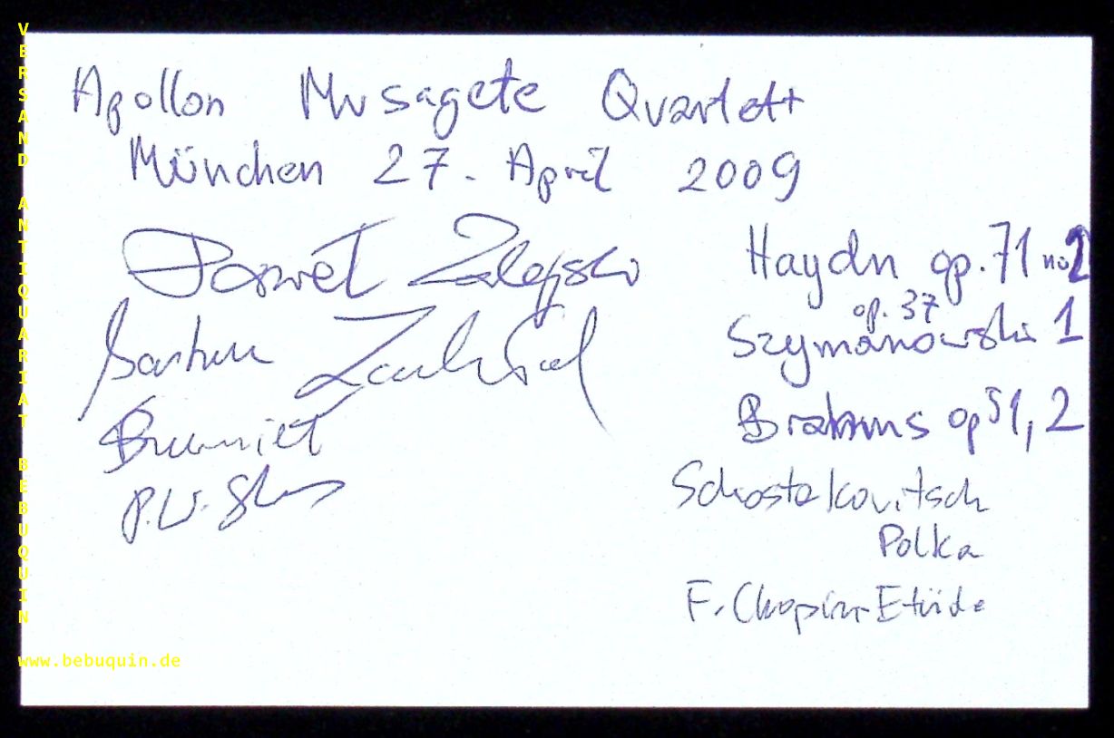 APOLLON MUSAGETE QUARTETT.– ZALEJSKI, Pawel + ZACLOD, Bartosz + SZUMIEL, Piotr + SKWERES, Piotr: eigenhändig von allen signiert und datierte Autogrammkarte. München (Philharmonie), 27.4.2009. 8 x 12,5 cm. Karteikarte. Das Apollon Musagète Quartett (abgekürzt: AMQ) ist ein polnisches Streichquartett, das 2006 in Wien gegründet wurde und 2008 international bekannt wurde, als es den ARD-Musikwettbewerb in der Kategorie Streichquartett gewann. Das Ensemble spielt die gängige Quartettliteratur von Johann Sebastian Bach bis in die Moderne, mit besonderer Berücksichtigung polnischer Musik. (Wikipedia)