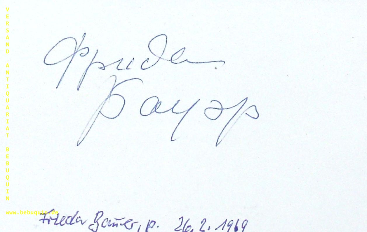 OISTRACH, David (Violinist) + BAUER, Frieda (Pianistin): eigenhändig signierte (auf der Vorder- bzw. Rückseite) Autogrammkarten. München (Kongresssaal), 26.2.1969. 8 x 12,5 cm. Karteikarte. Dawid Fjodorowitsch Oistrach (Eustrach) (* 17. Septemberjul./ 30. September 1908greg. in Odessa; † 24. Oktober 1974 in Amsterdam) war ein sowjetischer Geiger jüdischer Abstammung, der in der Musikwelt des 20. Jahrhunderts eine bedeutende Rolle spielte. (Wikipedia)