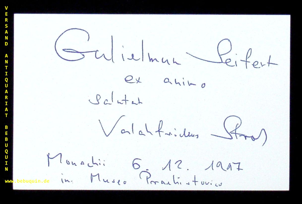 STROH, Valahfridus (d.i. Wilfried): eigenhändig signierte und datierte Autogrammkarte mit eigenhändiger lateinischer Zueignung an Wili Seifert. München (Herkulessaal), 6.12.1997. 8 x 10,5 cm. Karteikarte Wilfried Stroh (* 26. Dezember 1939 in Stuttgart), auch Valahfridus, ist ein deutscher Klassischer Philologe. (Wikipedia)