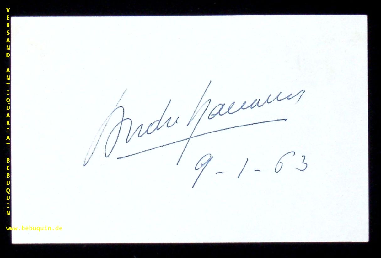 NAVARRA, André (Cellist): eigenhändig signierte und datierte Autogrammkarte. München, 9.1.1963. 8 x 12,5 cm. Karteikarte. André Navarra (* 13. Oktober 1911 in Biarritz; † 31. Juli 1988 in Siena) war ein französischer Cellist, der zusammen mit Pierre Fournier, Paul Tortelier und Maurice Gendron die große französische Cellotradition prägte. (Wikipedia)