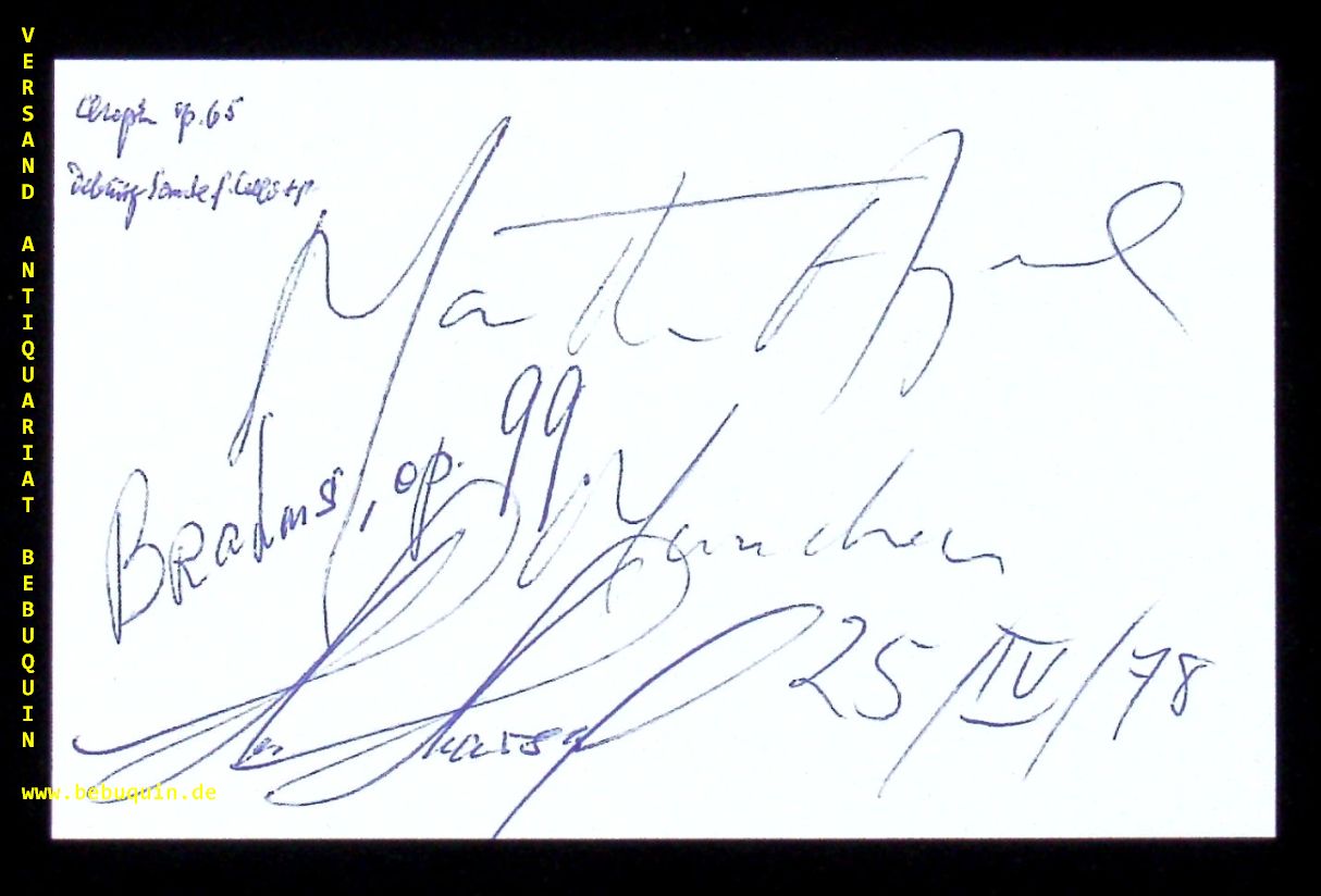 ARGERICH, Martha (Pianistin) + MAISKY, Mischa (Cellist): eigenhändig von beiden signierte und datierte Autogrammkarte. München (Herkulessaal), 25.4.1978. 8 x 12,5 cm. Karteikarte. Martha Argerich (* 5. Juni 1941 in Buenos Aires) ist eine argentinisch-schweizerische Pianistin. Im Jahr 2005 erhielt sie die Auszeichnung Praemium Imperiale, den „Nobelpreis der Künste“. Im Jahr 2014 wurde sie mit dem ECHO Klassik in der Kategorie „Konzerteinspielung des Jahres (Klavier)“ mit dem Orchestra Mozart Bologna unter Claudio Abbado für Mozarts Klavierkonzerte 20 & 25 ausgezeichnet. 2016 erhielt sie den Kennedy-Preis. Mischa Maisky (* 10. Januar 1948 in Riga, Sowjetunion, heute Lettland) ist ein klassischer Cellist und gilt als einer der besten Cellisten der Gegenwart. Er lebt heute in Waterloo bei Brüssel. (Wikipedia)