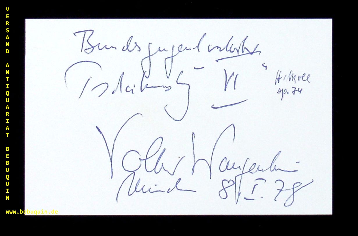 WANGENHEIM, Volker (Komponist, Dirigent): eigenhändig signierte und datierte Autogrammkarte: Debut. München, 8.1.1978. 8 x 12,5 cm. Karteikarte. Volker Wangenheim (* 1. Juli 1928 in Berlin; † 23. April 2014 in Altenkirchen) war ein deutscher Dirigent, Arrangeur und Komponist. (Wikipedia)