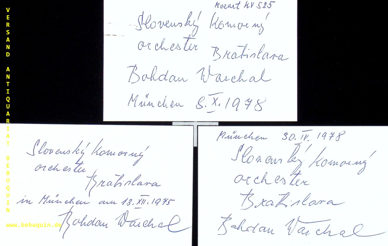 WARCHAL, Bagdan (Dirigent): 3 eigenhändig signierter und datierter Autogrammkarten. München, 1975 – 1978. 8 x 12,5 cm. 3 Karteikarten. Bohdan Warchal (* 27. Januar 1930 in Orlová, Tschechoslowakei; † 30. Dezember 2000 in Bratislava, Slowakei) war ein slowakischer Violinist, Mitglied des Slowakischen Philharmonischen Orchesters sowie Leiter und Solist des Slowakischen Kammerorchesters. (Wikipedia)