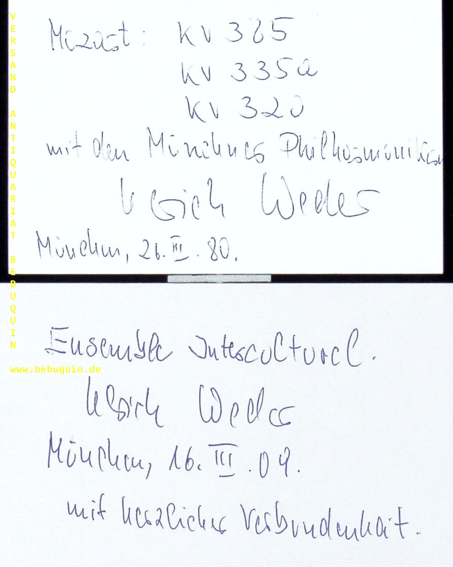WEDER, Ulrich (Dirigent): 2 eigenhändig datierte und signierte Autogrammkarten. München (Philharmonie), 1980 + 2009. 8 x 12,5 cm. 2 Karteikarten. Ulrich Weder (Dirigent) (1934–2012), deutscher Dirigent. (Wikipedia)
