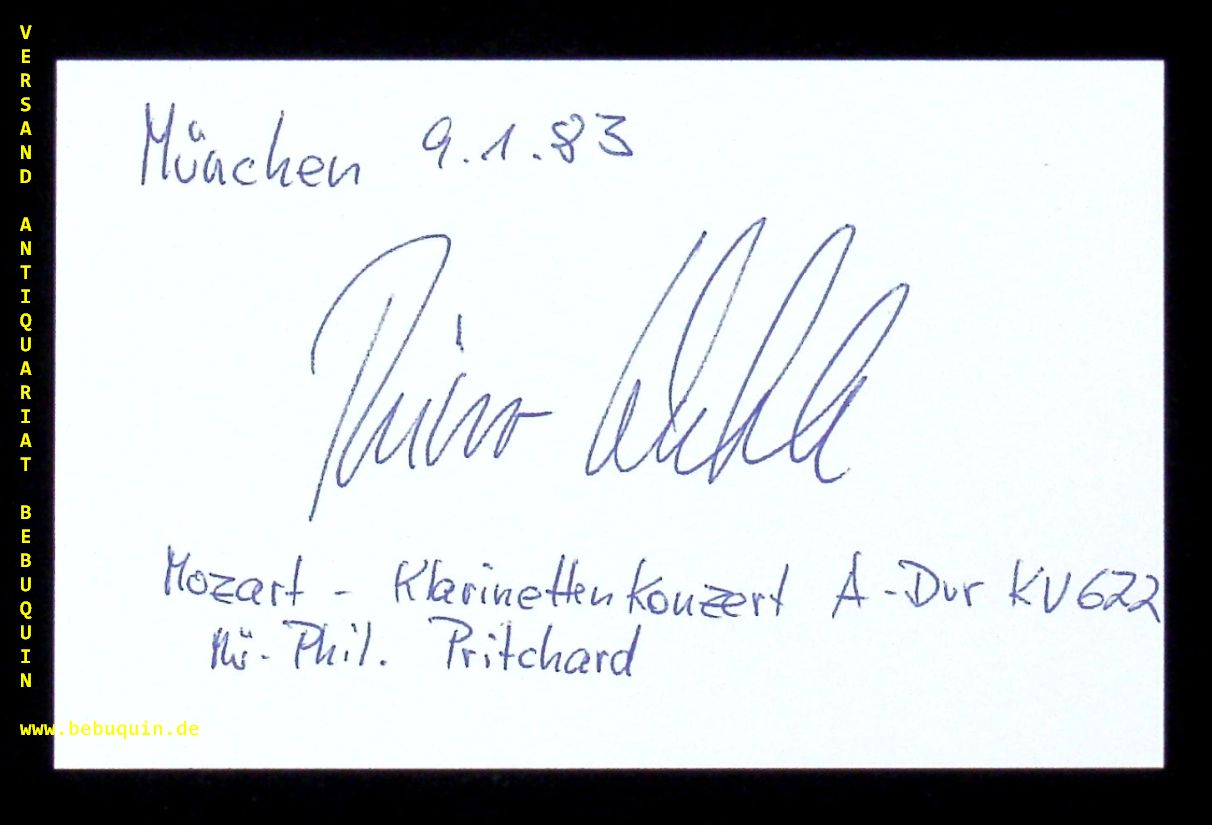 WEHLE, Reiner (Klarinettist): eigenhändig datierte und signierte Autogrammkarte. München (Philharmonie), 9.1.1983. 8 x 12,5 cm. Karteikarten. Reiner Wehle (* 27. Mai 1954 in Kiel) ist ein deutscher Klarinettist und Autor. (Wikipedia)