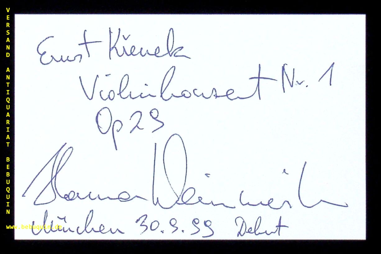 WEINMEISTER, Hanna (Violinistin): eigenhändig signierte und datierte Autogrammkarte. München, 30.9.1999. 8 x 12,5 cm. Karteikarte. Seit 1998 ist Hanna Weinmeister Erste Konzertmeisterin des Orchesters der Oper Zürich und betreute von 2000 bis 2004 eine Violinklasse an der Hochschule für Musik und Theater Bern.