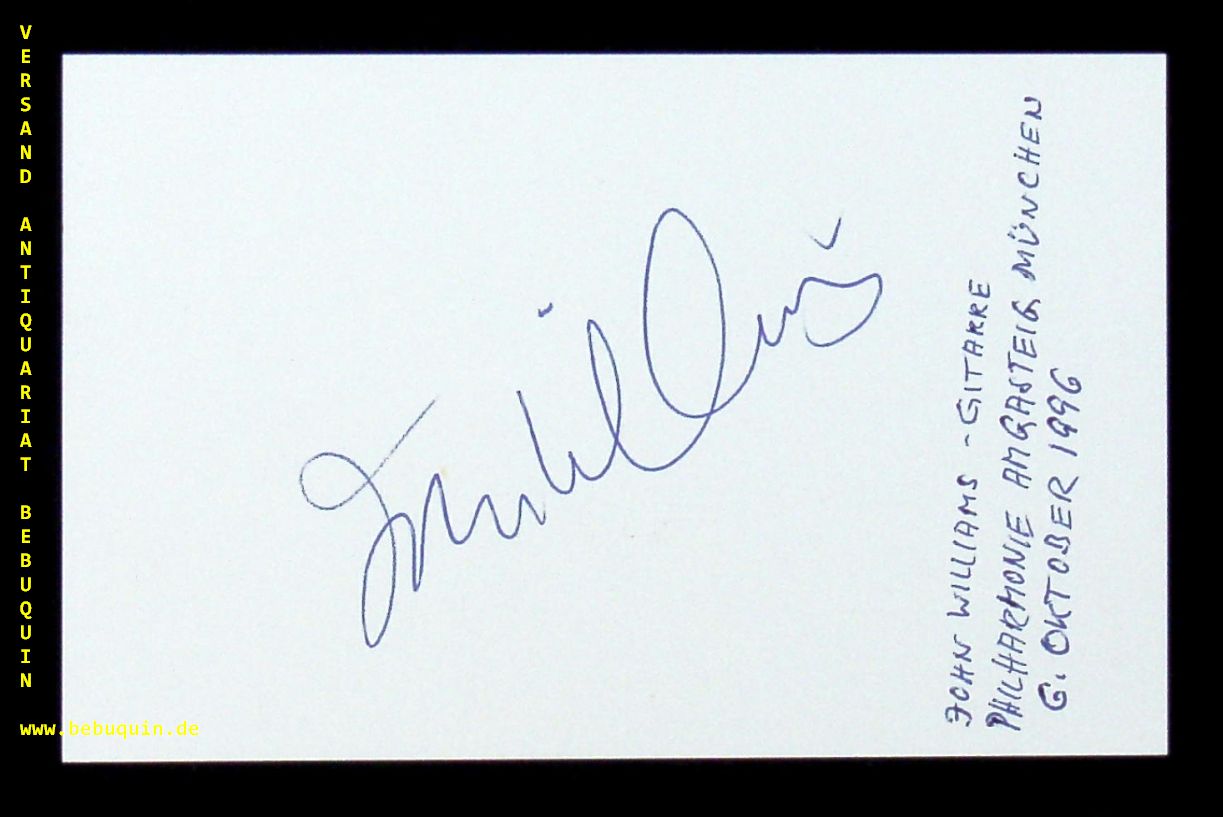 WILLIAMS, John (Gitarrist): eigenhändig signierte Autogrammkarte. München (Philharmonie), 6.10.1996. 8 x 12,5 cm. Karteikarte. John Christopher Williams (* 24. April 1941 in Melbourne) ist ein australischer Gitarrist. (Wikipedia)