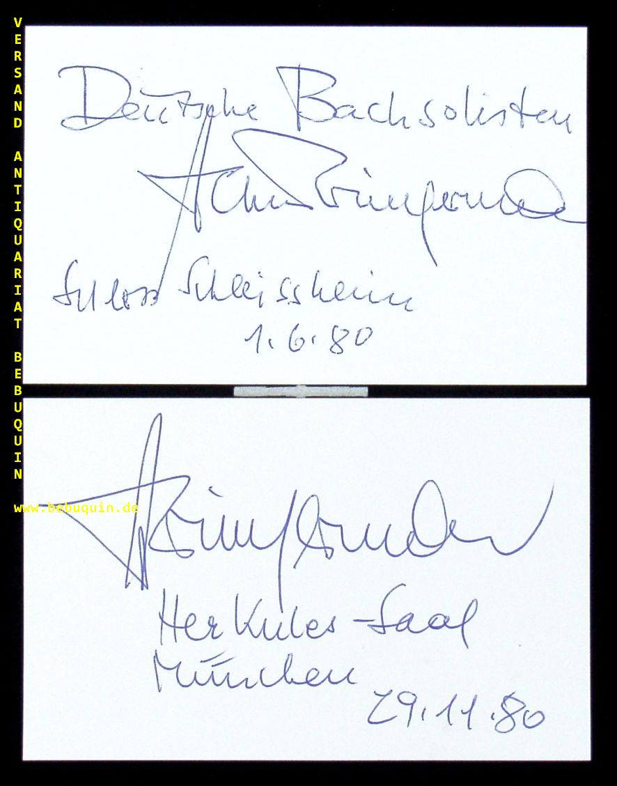 WINSCHERMANN, Helmut (Oboist, Dirigent): 2 eigenhändig signierte und datierte Autogrammkarte. München (Philharmonie), 1980. 8 x 12,5 cm. Karteikarten. Helmut Winschermann (* 22. März 1920 in Mülheim an der Ruhr; † 4. März 2021 in Bonn war ein deutscher Oboist, Hochschullehrer und Dirigent. (Wikipedia)