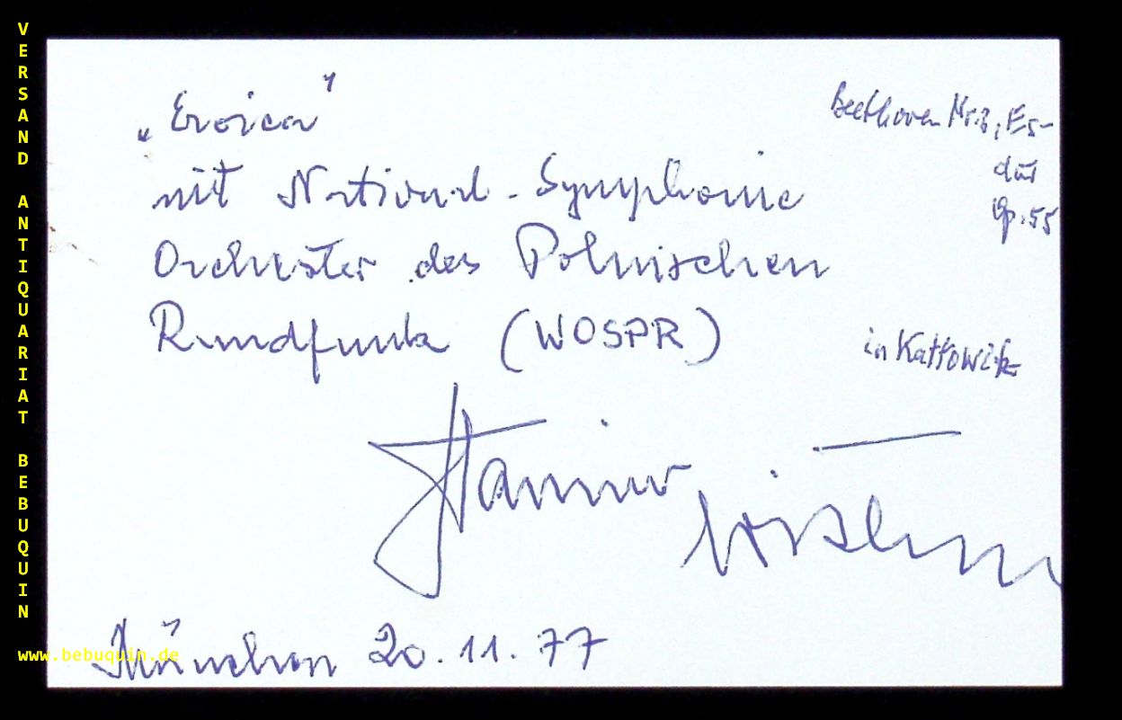 WISLOCKI, Stanislaw (Dirigent): eigenhändig signierte und datierte Autogrammkarte mit eigenhändiger Programmbeschreibung. München (Herkulessaal), 20.11.1977. 8 x 12,5 cm. Karteikarte. Stanislaw Wislocki (* 7. Juli 1921 in Rzeszów; † 31. Mai 1998 in Warschau) war ein polnischer Komponist, Dirigent, Pianist und Musikpädagoge. (Wikipedia)