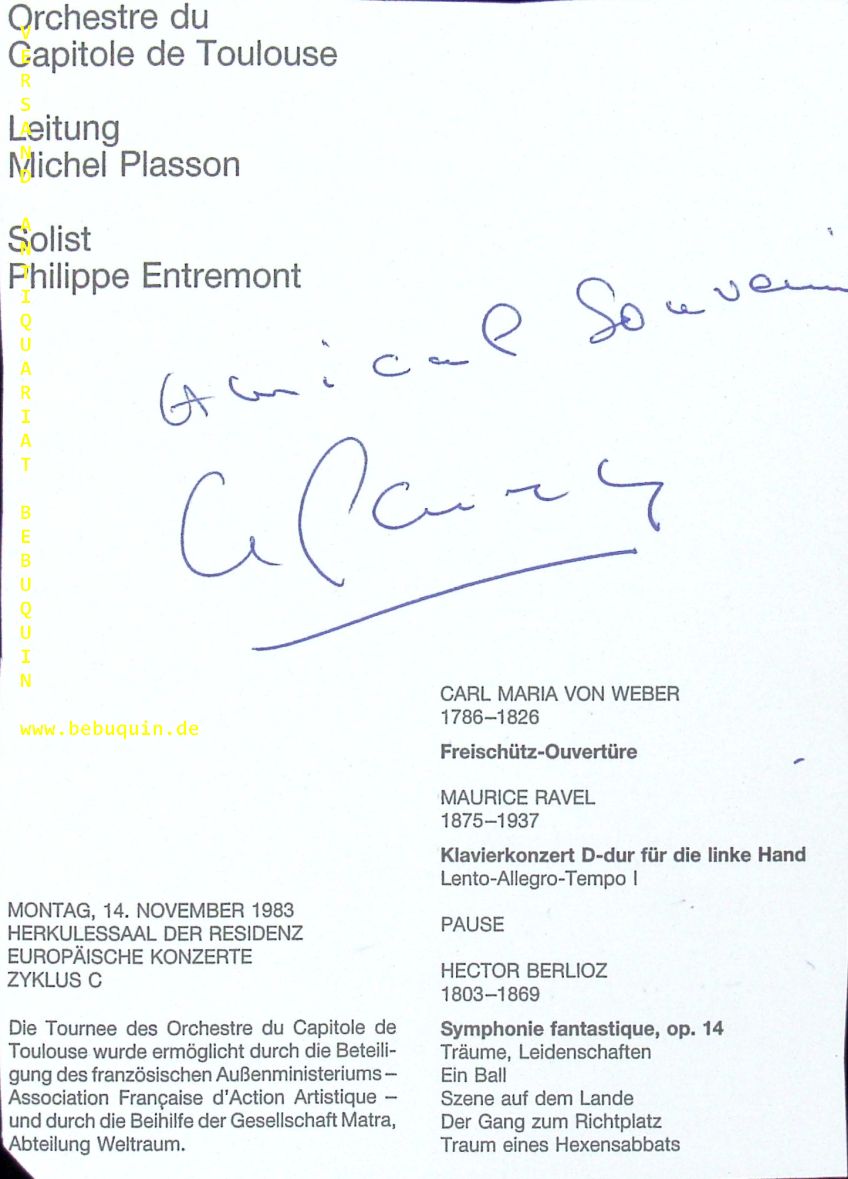 PLASSON, Michel (Dirigent): eigenhändig signierter Programmausschnitt: Amical Souverir. München (Herkulessaal), 14.11.1983. 19 x 14 cm. 1 Bl. Michel Plasson (* 2. Oktober 1933 in Paris) ist ein französischer Dirigent. (Wikipedia)