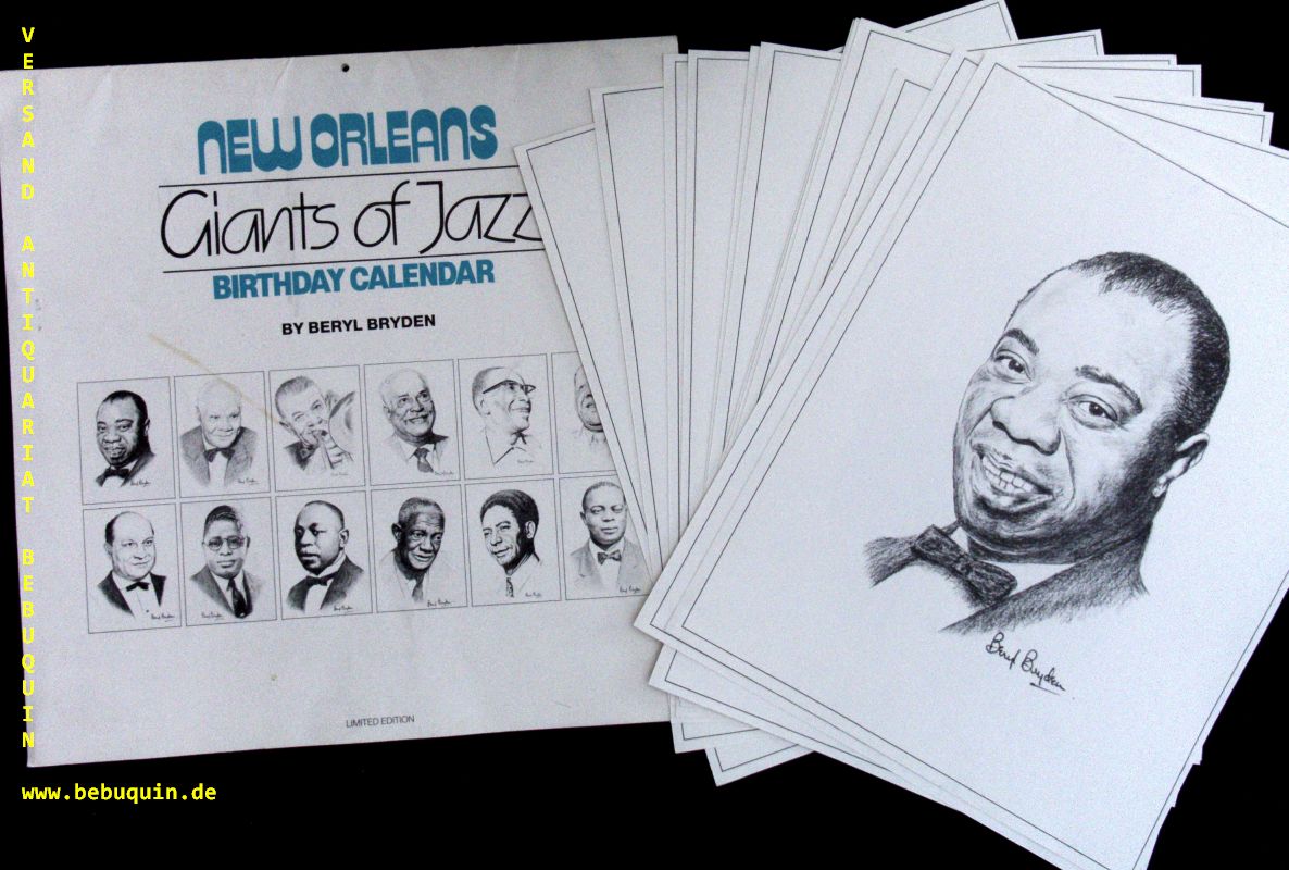 JAZZ.– BRYDEN, Beryl: Giants of Jazz.– New Orleans. Birthday Calendar. London (Walkerprint), ca 1970. 4°. 12 Bl. nach Kohlezeichnungen der berühmtesten Jazzgrößen in der Größe 28 x 22 cm. in ill. OKartMappe. Die Blätter sind rückseitig handschriftlich mit dem Namen des jeweils dargestellten beschrieben. Die Waschbrettspielerin und Sängerin Beryl war auch eine begabte Zeichnerin, die viele „Giants of Jazz“, allen voran ihre großen Idole Louis Armstrong und Bessie Smith, mit dem Kohlestift verewigte; ihre „birthday calendars“ sind ebenso wie ihre zahlreichen Schallplatten begehrte Sammlerstücke geworden. Die letzte „Red Hot Mama“ oder „Britains Queen of the Blues“, wie sie auf der Insel genannt wurde, begann ihre Laufbahn 1945 mit „George Webb’s Dixielanders“, damals noch „non-professional“. Ihren erlernten Beruf als Sekretärin gab sie auf, als ihre Stimme immer gefragter wurde, und im Lauf der Jahre folgten Auftritte mit allen Größen vor allem des europäischen traditionellen Jazz, wie Chris Barer, Monty Sunshine, Alex Welsh oder Fatty George, um nur einige zu erwähnen.