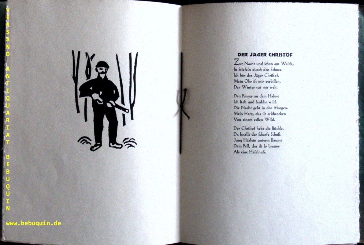 VRING, Georg von der: Südergast. 12 Gedichte und 6 Holzschnitte. Jever, 1925. 4°. 14 Bl. mit 6 Holzschnitten des Künstlers. OKart. mit OHolzschnitt. Einband lichtrandig. = 1. Sonderdruck der EOS-Presse Piesteritz. EA des Erstlingswerks mit spätexpressionistischen Gedichten. WG² 1.