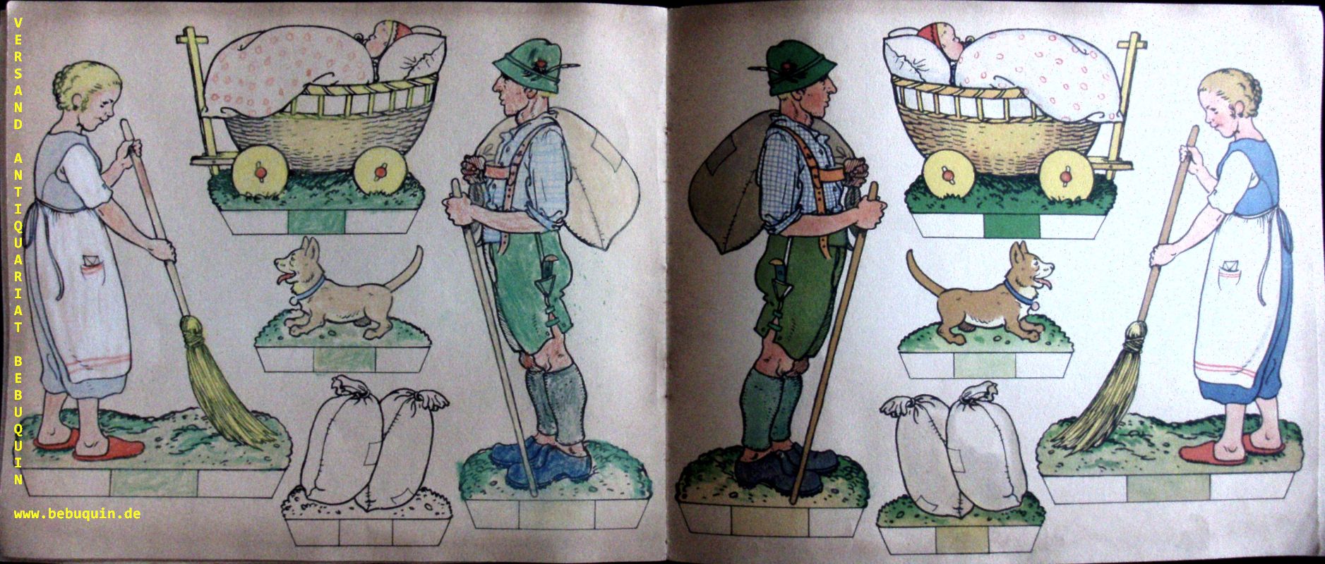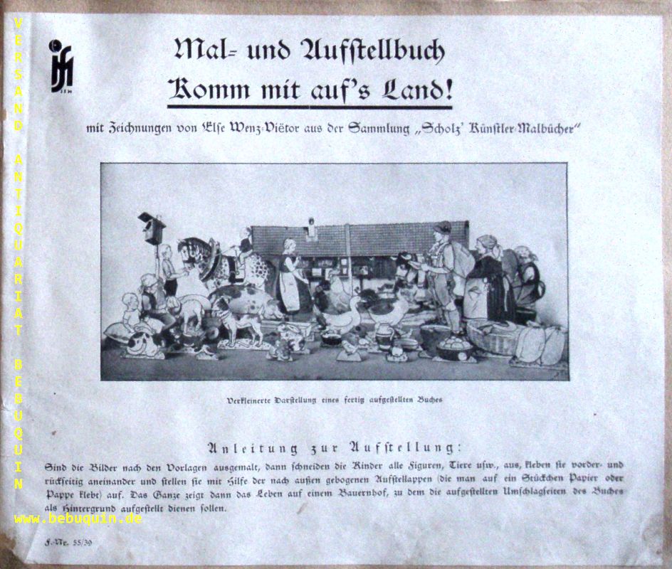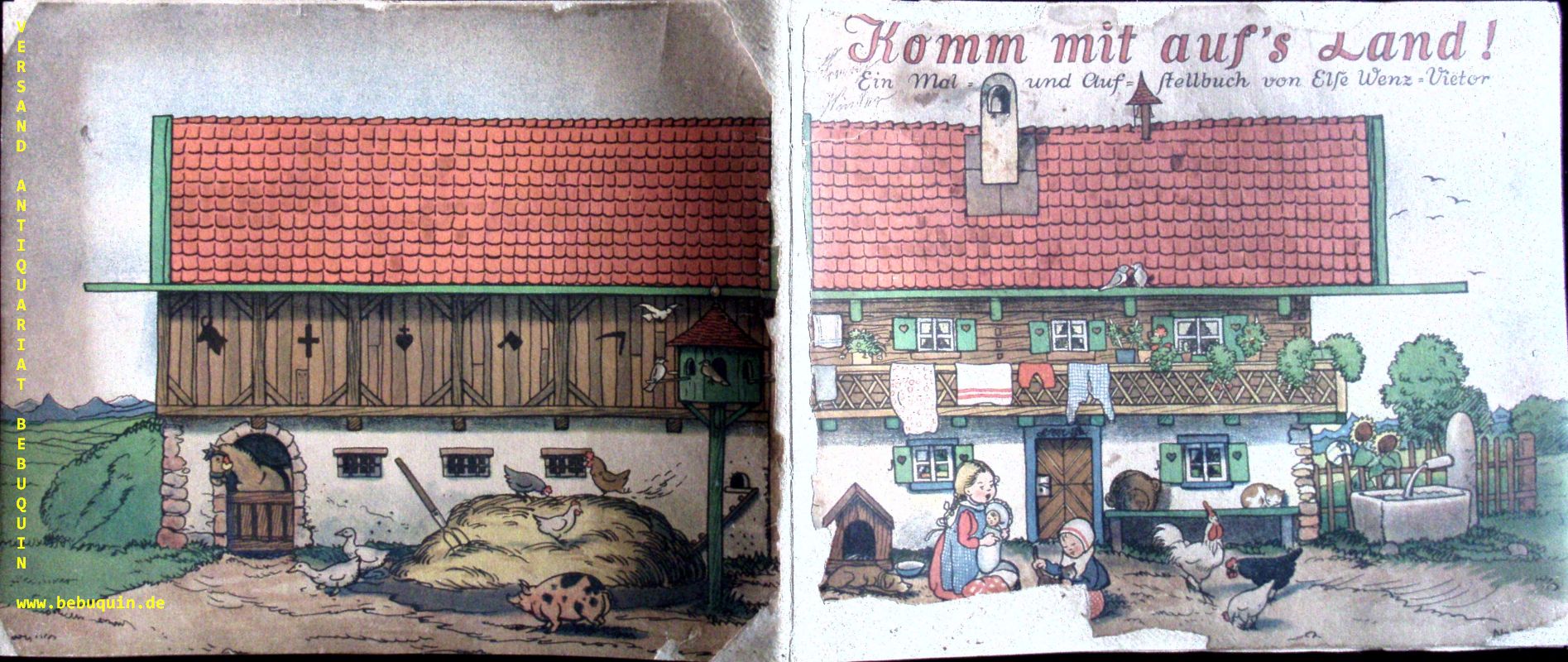AUFSTELLBILDERBÜCHER.– WENZ-VIETOR, Else: Komm mit auf’s Land. Ein Mal- und Aufstellbuch. Mainz (Jos. Scholz), (1938) 22 x 26 cm. 12 einseitig bedruckte Bl. mit 6 farb. Bildtafeln und 6 motivgleiche Bildtafeln zum Ausmalen sowie ein beigebundenes Blatt mit der Anleitung der Aufstellung. farb. ill. OKart. als aufklappbares Bauernhaus. Einband fachmännisch auf Karton aufgezogen, Kanten und Rücken mit Fehlstellen, innen viele Bilder ausgemalt, ein ausgemaltes Bild (kleines Häschen) leider ausgeschnitten und sauber hinterlegt, Farbtafeln aber sehr fein. = Scholz Künstler Malbücher No. 620. Absolut rares Stück. Laut Bibliographie konnte ein Exemplar bisher nicht gefunden werden. Bad Pyrmont 108.