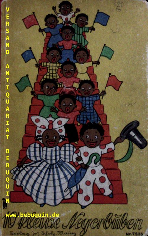 ZEHN KLEINE NEGERBUBEN.– Mainz (Jos. Scholz), (1936). 28 x 18 cm. 6 (incl. Einband) farb. illustrierte Hartpappen mit Bildern von [Beatrice Braun-Fock.] farb. ill. OHLn. Einband gering angeschmutzt, ansonsten gute Erhaltung. Diese Ausgabe von allergrößter Seltenheit. Verlagsnummer 7205. Einzig mir zugänglicher Nachweis bei DBV 21, S. 364., Schug 1909.