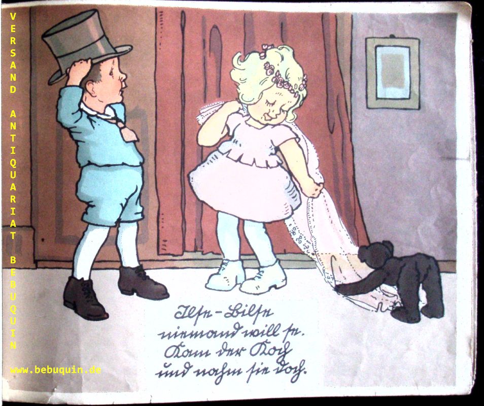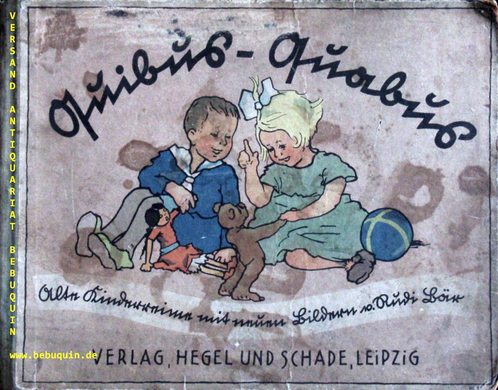 BÄR, Rudi: Quibus – Quabus. Alte Kinderreime mit neuen Bildern. Leipzig (Hegel und Schade), (1926). Quer 4°. 10 Bl. mit farb. Bildstafeln. farb. ill. OHLn. Einband angeschmutzt und fleckig, Bildtafeln in strahlender Farbigkeit, Blattränder mit einigen kleineren Läsuren, Gelenke mit Papierstreifen verstärkt. EA von allergrößter Seltenheit. In deutschen Bibliotheken nur ein Ex. in Leipzig nachgewiesen.