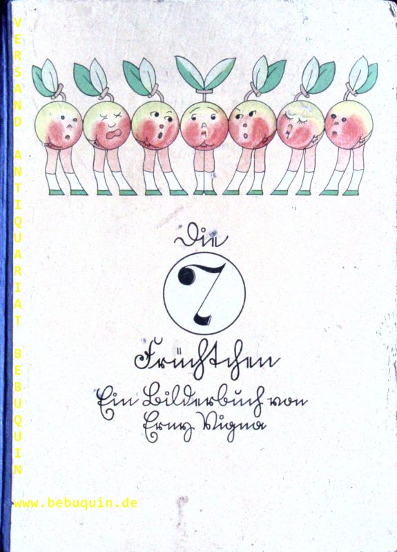 VIGNA, Erny: Die sieben Früchtchen. Ein Bilderbuch. Berlin-Grunewald (Klemm), (1932). 4°. 20 Bl. mit farb. Illustrationen des Verfassers in Sütterlin. farb. ill. OHLn. Einband etwas berieben und bestoßen, innen von guter Erhaltung. seltene EA dieser skurril und eigenwillig illustrierten Struwwelpeteriade mit 6 Geschichten, die ganz neue Unarten schildern. Rühle 406 beschreibt nur 19 Bl. und kennt wohl nicht die letzte Illustration sowie die Verlagswerbung auf der letzten Seite.