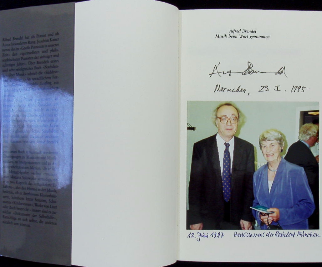 BRENDEL, Adrian (Cellist): Musik beim Wort genommen. Essays und Vorträge nebst Gesprächen mit Terry Snow und Konrad Wolff. München (Piper), 1990. 278 S. mkt zahlr. Notenbeispielen. OLn mit OUschl. EA mit einem mont. Farbfoto vom Konzert im Herkulessaal am 12. Juni 1997 vom Verfasser eigenhändig signiert und datiert auf Vortitel.