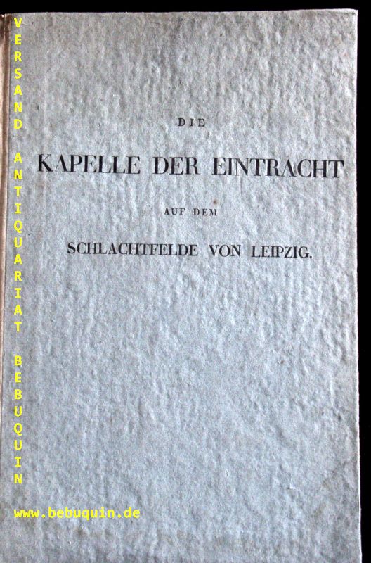 LEIPZIG.– BERTUCH, Carl: Die Kapelle der Eintracht auf dem Schlachtfelde von Leipzig. Ein Versuch. Wien, Weimar (Schaumburg, Landes-Industrie-Comptoir), 1814. Fol. 7 S. + 1 Kupferstichtafel. OPb mit schwarzgeprägter Schrift. Einband am Rand angeschmutzt, innen nur leicht stockig, insgesamt von überraschend guter Erhaltung.