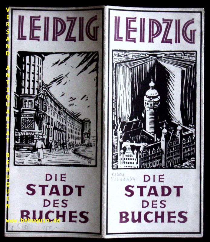 LEIPZIG.– LEIPZIG DIE STADT DES BUCHES.– Hrsg. vom Ratsverkehrsamt Leipzig.– Leipzig (Drugulin), ca 1928. Gr. 8°. 6 Bl. (incl. Umschlag) mit zahlr. fotografischen Bildern von Leipzig und einer Karte. ill. OKart mit zwei Original Holzschnitten von Oskar Kokoschka mit Leipzigmotiven. mittig als Prospekt gefaltet. sehr seltene EA mit den eindrucksvollen Stichen Kokoschkas, die Leipziger Messe darstellend sowie die Nikolaikirche im Schatten eines riesigen aufgeschlagenen Buches.