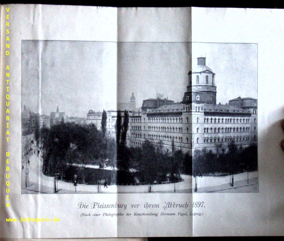 LEIPZIG.– PAUL, Hugo: Die Pleißenburg in Leipzig. Von ihrem Entstehen bis zur Gegenwart. Leipzig (Zangenberg & Hiimly), 1897. 78 (2) S. mit gestochener Titelvignette + 8 Ansichten aus vier Jahrhunderten auf teils gefalteten Bildtafeln. HLn der Zeit mit eingebundenem ODeckel, dieser mit gestochener Ansichtsvignette. feines Ex. EA von allergrößter Seltenheit, hier komplett mit allen Ansichten.