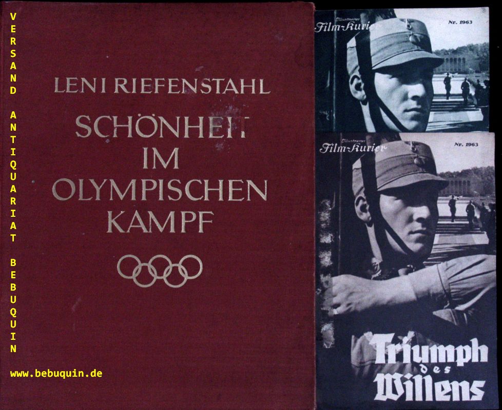 RIEFENSTAHL, Leni: Schönheit im olympischen Kampf. 2. Aufl. Berlin (Deutscher), 1937. Gr. 4°. 281 S. mit 273 Bildtafeln. OLn mit goldgeprägtem Titel. Kanten berieben, NaT, vorderes Gelenk etwas gelockert. inliegend 2 x „Illustrierter Film-Kurier Nr. 1963“ und 5 original Pressefotos der Olympiade 1936 von Hoffmann / Berlin.