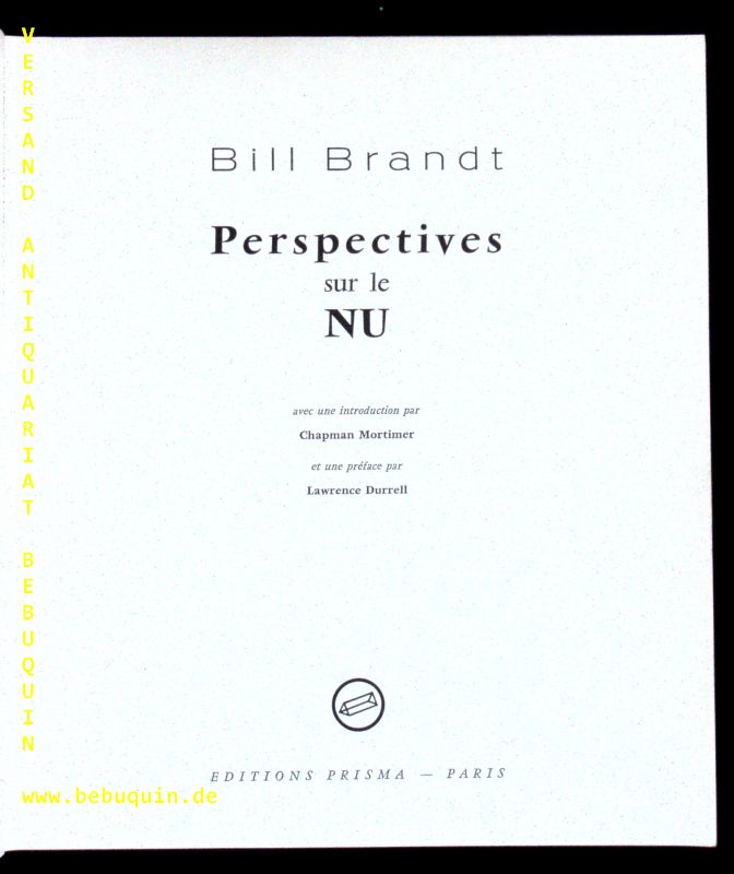 BRANDT, Bill: Perspectives sur le Nu. Avec introduction par Chapman Mortimer et une preface par Larence Durrell. Paris (Prisma), 1961. 4°. 14 S. + 90 fotografische Bildtafeln. OHLn. leicht bestaubt, eine Seite mit Miniläsur, insgesamt sehr gut erhalten. One of most important photobooks ever published. Mentioned in all important publications about photobooks (Andrew Roth, The Book of 101 Books, page 160/161. Martin Parr, The Photobook, vol 1, page 216. The Open Book, The Hasselblad Center, Stockholm, page 1888/189. Alessandro Bertolotti, Books of Nudes, page 150/151. 802 photobooks of the M.+M. Auer collection, page 408). Hardback with dustjacket. 275 x 235 mm (9 1/4 x 8 3/4 in), 90 pages. 90 black and white photographs. Preface by Lawrence Durell; introduction by Chapman Mortimer. Text in french.