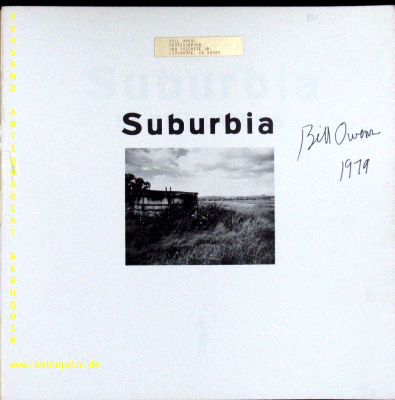 OWENS, Bill: Suburbia. 2. Print. San Francisco (Straight Arrow), 1973. 4°. o. S. mit zahlr. fotografischen Bildtafeln. ill. OKart. Block ausgebunden. Mit Owens eigenem Ex libris aus Goldpapier auf Vortitel sowie seine eigenhändige datierte (1979) Signatur daneben.