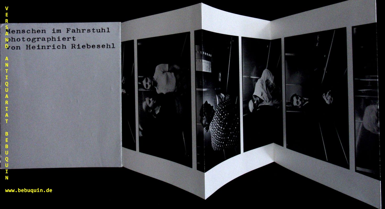 RIEBESEHL, Heinrich: Menschen im Fahrstuhl. Photographiert von Heinrich Riebesehl. Mit einem Text von Ursula Bode. Hamburg, (Staatliche Landesbildstelle), 1971. 4fach gefalt. Leporello mit 8 s/w Fotos. silberfarb. Orig.-Karton mit schwarz. gutes Ex. seltene EA.