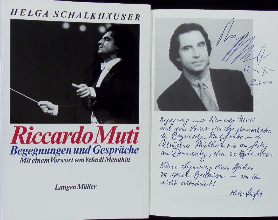 MUTI.– SCHALKHÄUSER, Helga: Riccardo Muti. Begegnungen und Gespräche. Mit einem Vorwort von Yehudi Menuhin. München (Langen Müller), 1994. 211 (4) S. mit zahlr. Bildern + 4 privaten Farbfotos vom 18. Oktober 1996. OPb mit OUmschl. EA mit einem eigenhänig signierten Portrait und einer eigenhändig signierten Farbfotografie auf Vorsatz und Titel montiert. Dazu der aufschlussreiche handschriftliche Text von Willi Seifert: „Begegnung mit Riccardo Muti nach dem Konzert (…) Keine Signierung dieses Buches zu seinem Bedauern – von ihm nicht autorisiert!“ Riccardo Muti (* 28. Juli 1941 in Neapel) ist ein italienischer Dirigent. (Wikipedia)