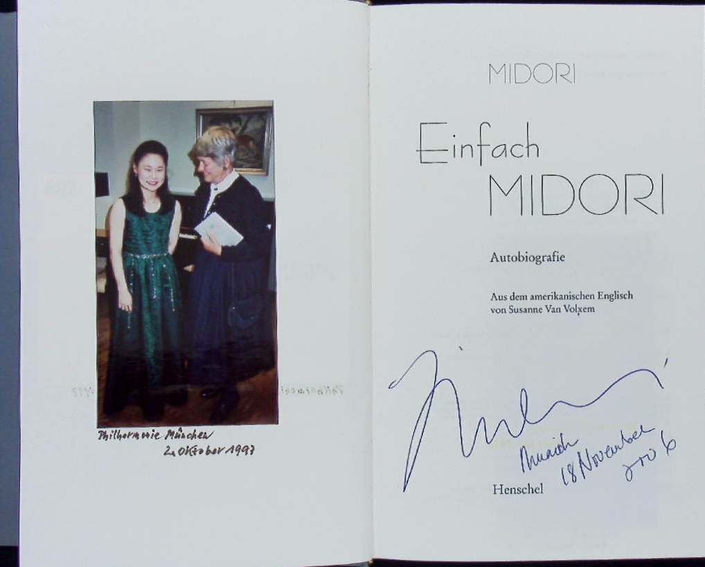 MIDORI (Violinistin): Einfach Midori. Autobiografie. D.v. Susanne Van Volxem. Berlin (Henschel), 2004. 287 (1) S. mit zahlr. teils farb. Bildern + 5 mont. farb. Privatfotos von Konzerten 1997 – 2004. OPb mit OUmschl. gutes Ex. EA mit der eigenhändigen datierten Signatur der Geigerin auf Titelseite. Midori Seiler (* 18. Februar 1969 in Osaka) ist eine deutsch-japanische Violinistin mit Schwerpunkt Musik des Barock und der Klassik. (Wikipedia)