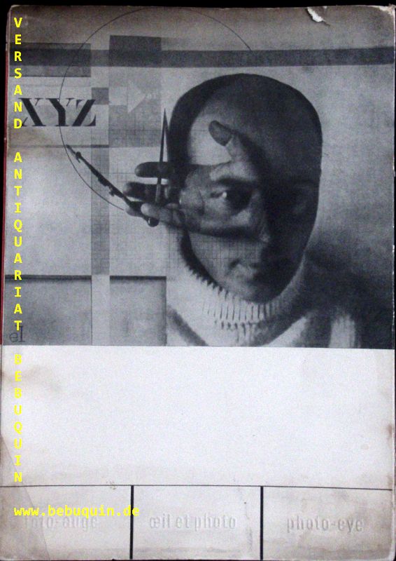 BAUHAUS.– ROH, Franz + TSCHICHOLD, Jan: Foto-auge. 76 Fotos der Zeit = oeil et photo = photo-eye. Stuttgart (Akademischer Verlag Dr. Fritz Wedekind), 1929. 4°. 18 Bl. 76 Tafeln in Form eines Blockbuchs. ill. OKart. Einband mit leichten Beschädigungen, vorderes Gelenk offen, anfangs einige Bleistiftmarginalien der Zeit, etwas wasserwellig. EA. Wichtiges Fotowerk des Bauhaus mit Fotografien von Buchartz, Feininger, Finsler, Heartfield, Man Ray, Moholy-Nagy, El Lissitzky, Vordemberge Gildewart u.a.