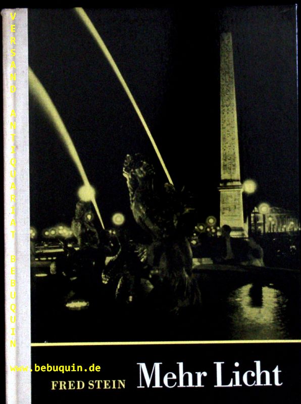 STEIN, Fred: Mehr Licht. Fotokarikaturen. München (Battenberg), (1968). Gr. 8°. 46 ungezählte Seiten mit ebensovielen Bildtafeln. ill. OHLn. tadello. EA des wohl seltensten Bandes des Fotografen. Alfred Stein (später Fred Stein, geboren 3. Juli 1909 in Dresden; gestorben 27. September 1967 in New York City) war ein Pionier der Kleinbildfotografie. Insbesondere seine Bildreportagen von den Straßen von Paris aus den 1930er Jahren und seine Portraits Albert Einsteins brachten Stein Weltruhm ein.