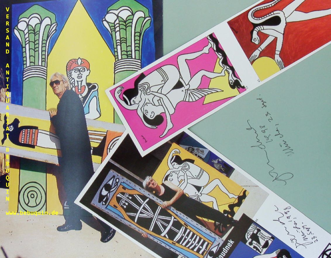 GAUDNEK, Walter: Nei Nile Art. Ausstellungskatalog. München, 1998. 30 x 20 cm. ca 40 S. mit 32 farb. Bildern. farb. ill. OKart. EA mit eigenhändig datierter und signierter Widmung auf Vorsatz sowie ebensolcher auif einer der beiliegenden Bildtafeln. Walter Gaudnek (* 1931 in Fleyh, Tschechoslowakei) ist ein moderner Künstler und Kunstprofessor an der University of Central Florida in Orlando. Gaudnek gehört seit den 1970er Jahren zu den Hauptvertretern der Pop-Art. Er griff als einziger Pop-Art-Künstler auch religiöse Themen (z. B. Kreuzweg in St. Michael in Schweinfurt) auf. (Wikipedia)