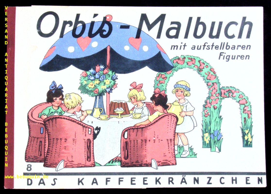 ORBIS – MALBUCH.– LINDEBERG, Carl: Das Kaffeekränzchen. Radebeul (Haupt & Hammon), 1932. quer-octavo. 6 ungezählte Blätter mit ausgestanzten heraustrennbaren teils farb. Illustrationen. farb. ill. OHLn. Deckelblatt mit leichten Schmutzrand, Stanzung teils gelöst, sonst gutes unbespieltes Ex. = Nr. 8. EA. Schmatz-Sprünkel S. 88 ff. „Diese reizenden Neuigkeiten bedeuten eine Umwälzung auf dem Gebiete der Kinderbücher … treffliche buntfarbige Malvorlagen, an deren Hand sie die gleichfalls beigegebenen Figuren beiderseits ausmalen können … aus dicker Pappe vorgestanzt, lassen sich zum Zweck der Bemalung heraustrennen. Mit einer Vorrichtung zum Aufstellen versehen, entstehen ohne Zuhilfenahme von Schere und Leimtopf ganz reizende Spielzeuge“ (aus der Verlagswerbung)