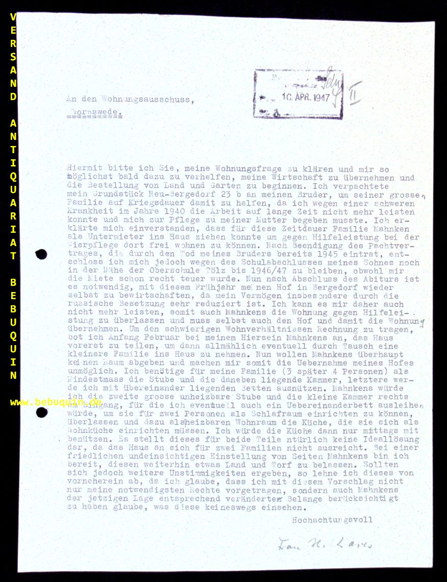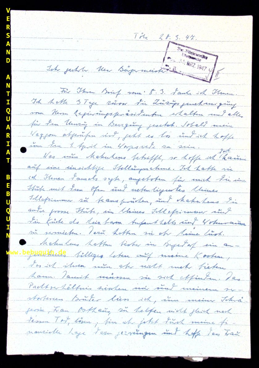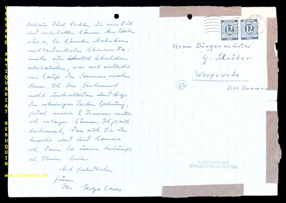 WORPSWEDE.– OSTHAUS, Helga: (hier als Helga Laves) 2 ausführliche inhaltsreiche signierte Briefe an den Bürgermeister von Worpswede (einer eigenhändig, einer ms) über Kriegs- und Nachkriegszeit der Tochter von Karl Ernst Osthaus, dem Gründer des Folkwang Museums. Ich bin bestimmt nicht unbescheiden und trage den schwierigen Zeiten Rechnung, jedoch meine 2 Zimmer muss ich verlangen können. Bad Tölz, 1947. 2 Bl. teils seitlich gelocht.